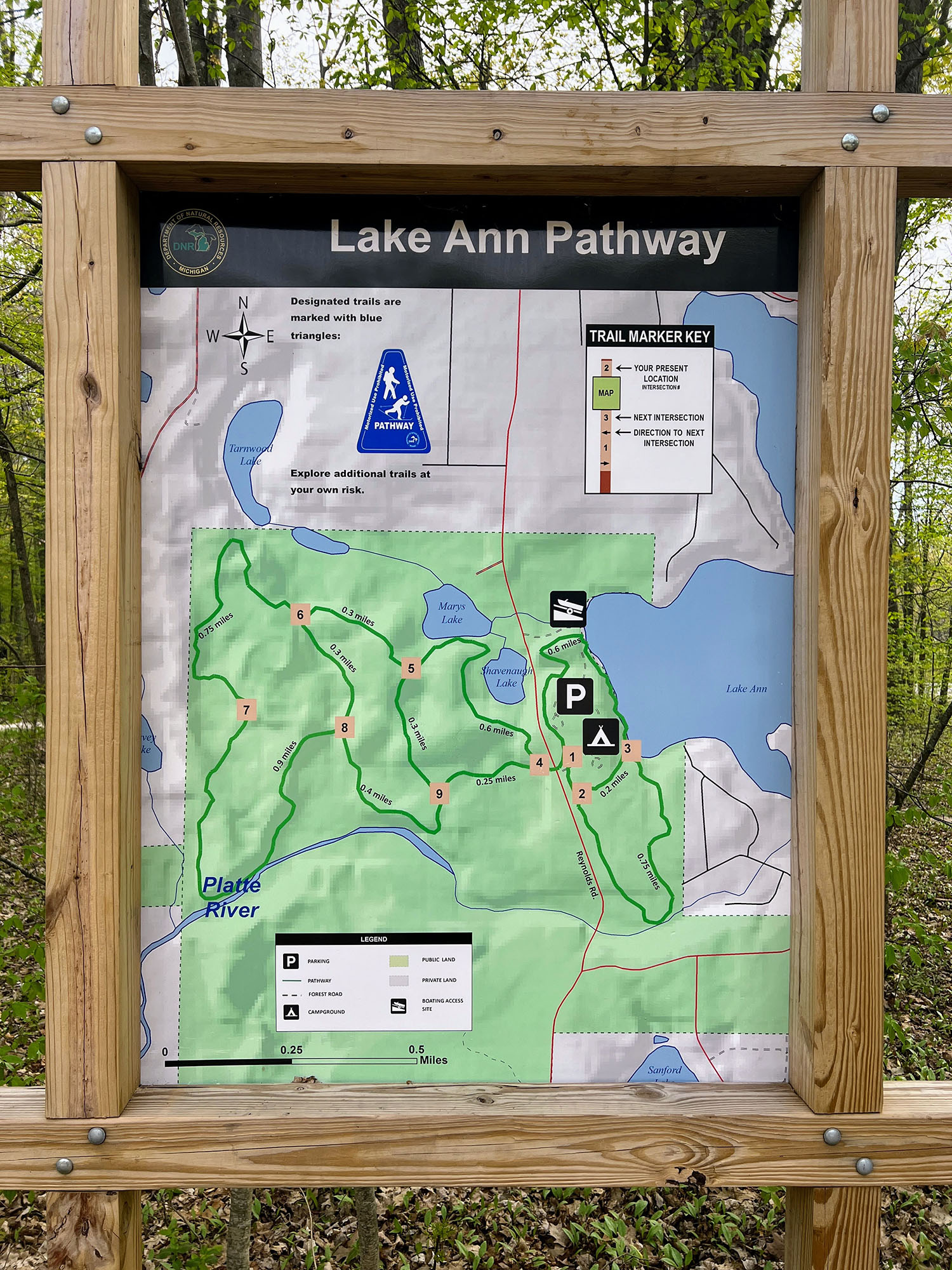 The Lake Ann Pathway is a popular trail, not too far from the Village of Lake Ann. It is composed of two main loops; the main parking area is next to a 1.8 mile loop that runs through the state forest campground, along the Platte River and Ann Lake. The 3.6 mile loop on the west side of Reynolds Rd is considered to be a more difficult and hilly course, and is thus not recommended for novice cross country skiers. It includes a few small loops that go by Mary’s Lake, Shavenaugh Lake, and the Platte River.
